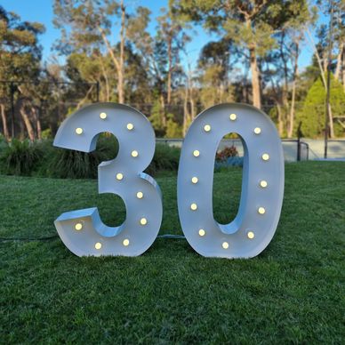 Our 1.2m tall light up marquee number range includes: 1, 10, 21, 30 & 40